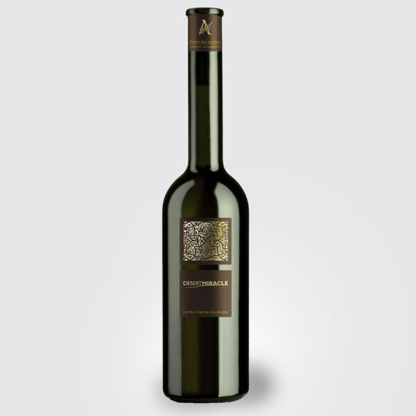 The fruitiness of ripe olives is clearly identifiable in the nose and mouth with a great diversity of secondary aromas, above all apple and banana. It also has hints of other ripe fruit such as almonds, tomato, fennel and artichoke. On the palate it reminds of almonds, its sweetness stands out a little, as well as its astringency that does not interfere with its profile. The result is a very well balanced and harmonious oil with a clear touch of sweetness that is characteristic of the variety. Desert Miracle is our ultra-premium extra virgin olive oil of character that surprises the most demanding palates with its special fruity notes.